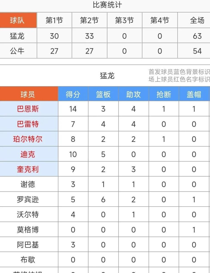 上半场双方的数据统计如下:公牛队的得分主要来自巴恩斯和怀特,分别贡献了14分和10分;而猛龙队则由珀尔特尔领衔,得到16分,特雷·琼斯和其他队友也积极得分,整体表现不俗。公牛的篮板球和助攻数稍显不足,猛龙则在防守端表现出色,制造了多次对手失误。双方在命中率上差距不大,竞争相当激烈。